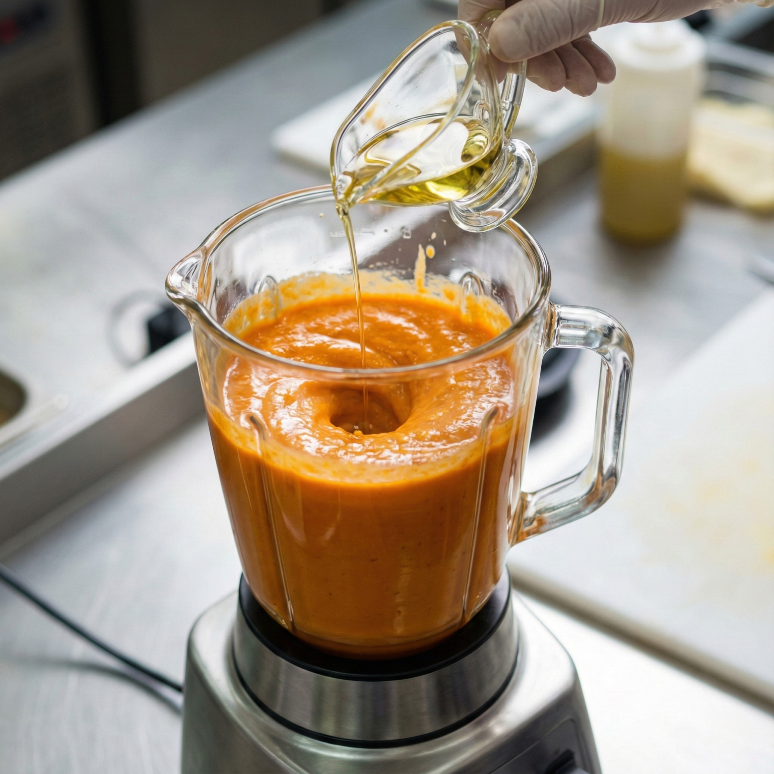 Blender çalışmaya devam ederken, 2.5 ölçü bitkisel yağı yavaşça ve ince bir ip gibi karışıma dökün. yaklaşık 1 dk karıştırın.