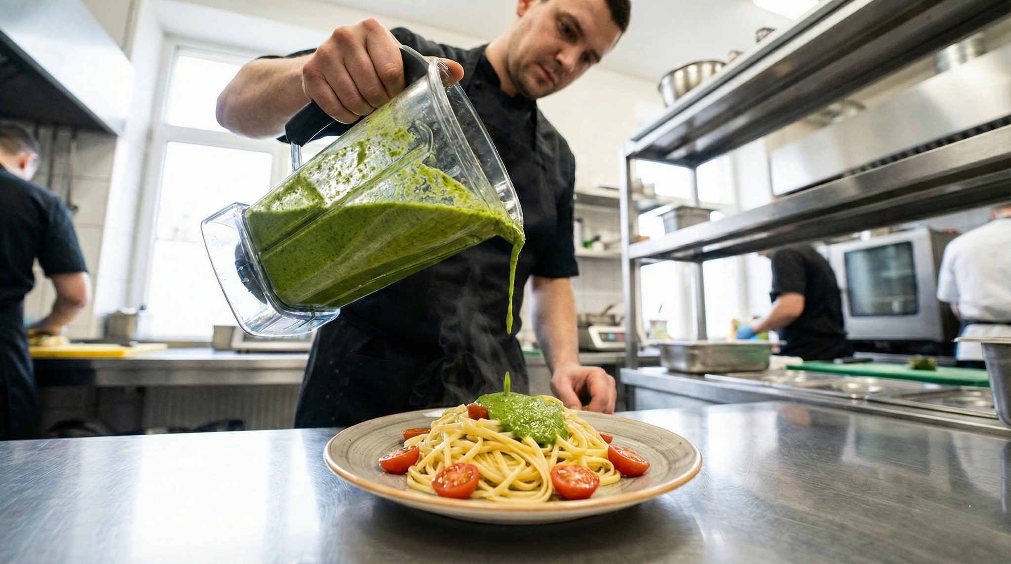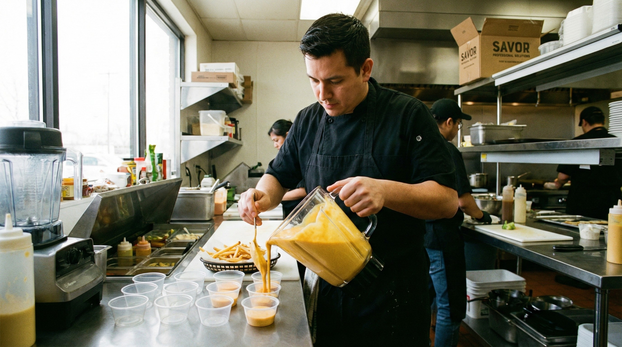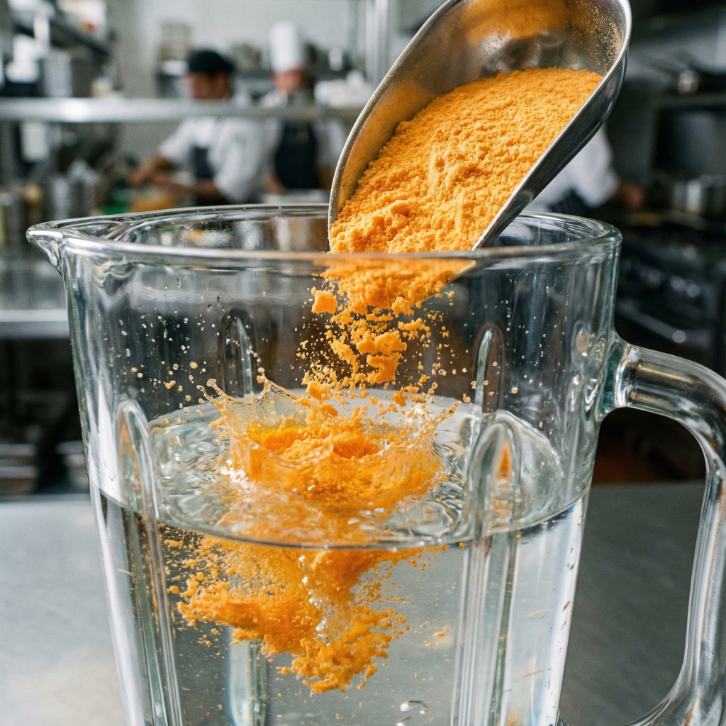 Blender haznesine önce 3 ölçü suyu, ardından 1 ölçü Savor toz karışımı ekleyin. (Önce su eklemek topaklanmayı önler).